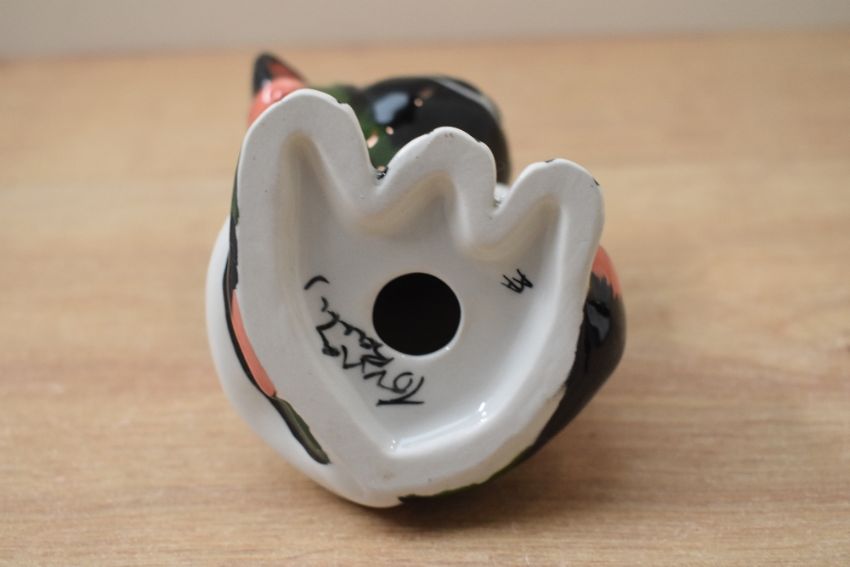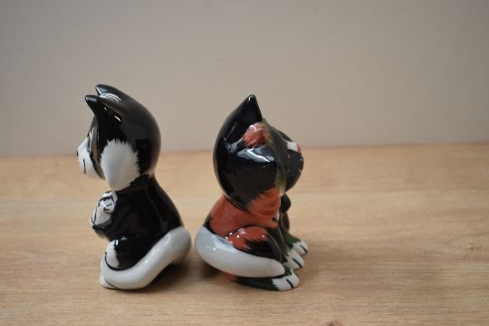 A Lorna Bailey Art-Deco style cat study 'Dozer' sold together with another Lorna Bailey Art-Deco style cat study having green and black colourway, both signed to underneath, measuring 14cm and 13cm tall.