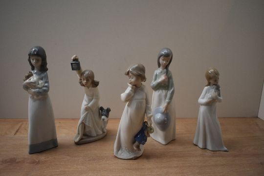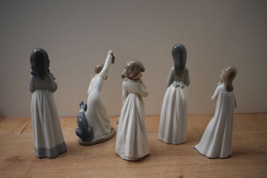 A group of five Nao by Lladro porcelain figurines to include 'My Rag Doll' model number 1108, 'Who is There' and 'Becky', two boxes present.
