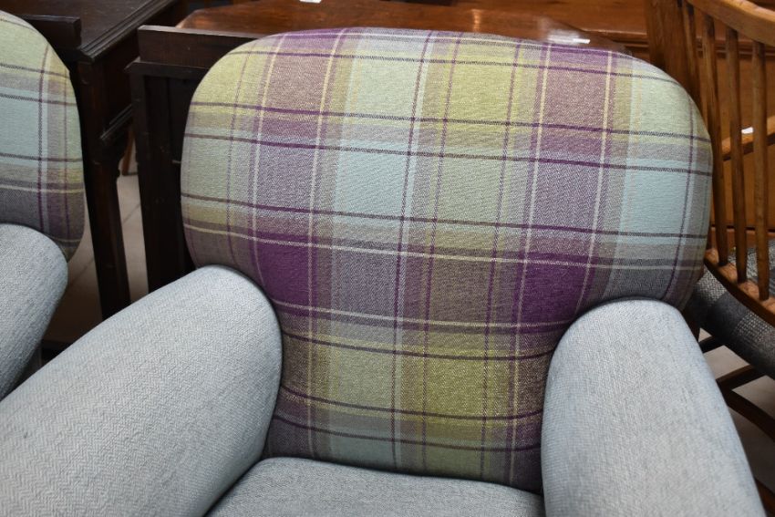 A Victorian mahogany framed settee having later colourful tweed upholstery, width approx. 150cm and a pair of early 20th Century armchairs in similar upholstery