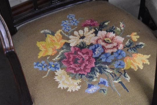 A group of five George III mahogany dining chairs, 4+1 carver, each with shaped top rail and carved and pierced urn form splat and vertical bars, the padded needlework seats raised on butterfly moulded front supports, linked by stretchers 45cm