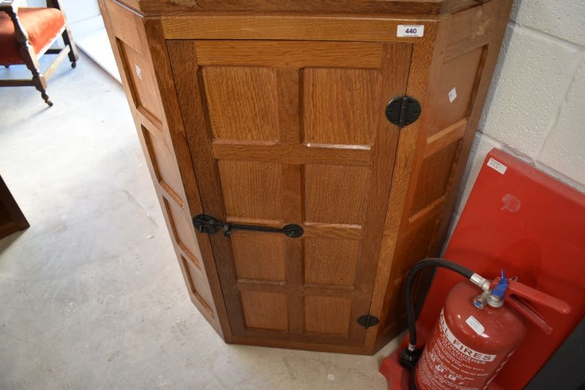 Workshop of Robert Mouseman Thompson of Kilburn; A golden oak wall corner cupboard, with panelled door enclosing three fixed shelves, wrought iron hinges and latch, straight-head screws, with carved mouse trademark 70cm wide, 47.5cm deep, 97cm high (plus additional plinth)