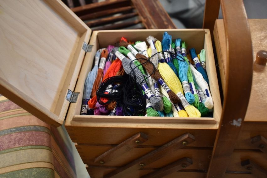 A vintage cantilever sewing box on legs and an upholstered ottoman style foot stool