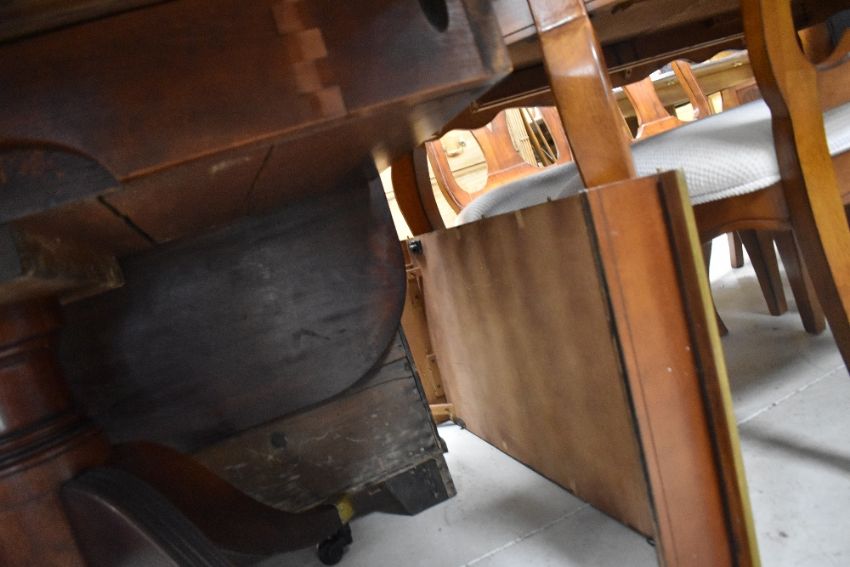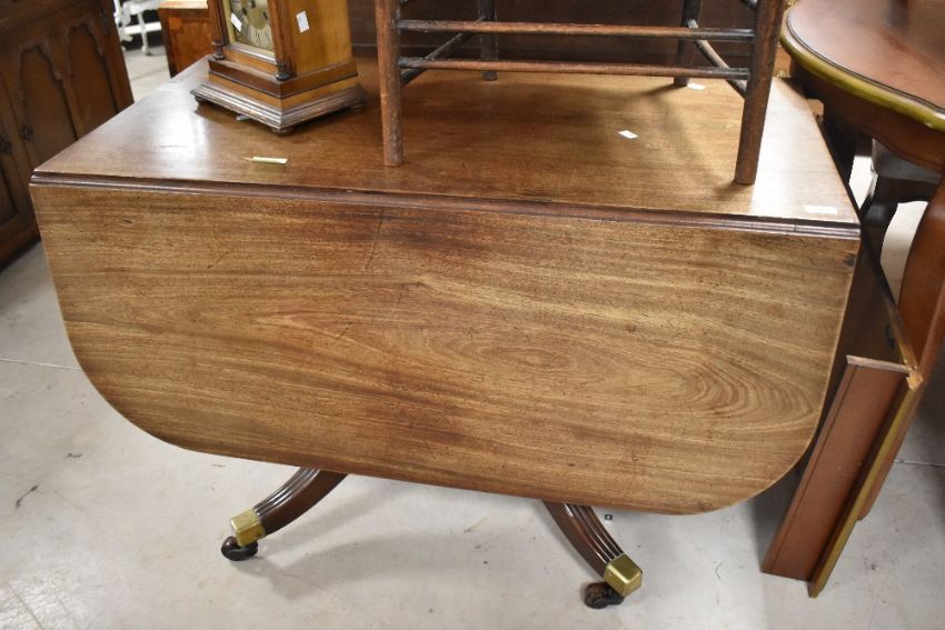 A 19th Century mahogany dining table in the Regency style having drop flaps and drawer to each end on bulbous support over quadrule splay legs terminating in pot castors, approx 109 x 141 (open) 58 (closed), height 72cm