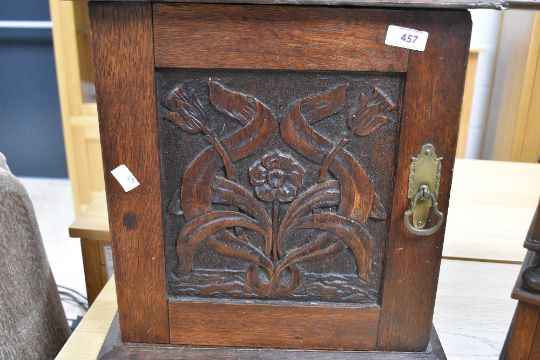 A Victorian oak cabinet having carved foliate and pokerwork decoration, possibly bathroom/medicine, dimensions approx. H38 D25 W38cm