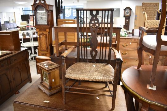 A traditional (late 19th or early 20th Century) rush seated armchair having spindle and wheelback