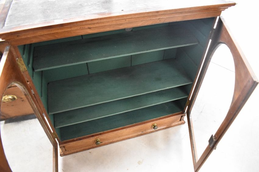 A Victorian mahogany bookcase top with wall mountings, having arched glazed section and single long drawer, dimensions approx. W90 D30 H90cm