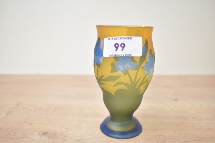 A small contemporary Émile Gallé-style reproduction cameo glass vase, with acid-etched floral decoration, signed 'Gallé' and 'TIP', 11cm, condition consistent with age and use, with small areas of surface wear. The additional 'TIP' signature identifies the vase as a later reproduction made in the style of Émile Gallé, rather than an original Art Nouveau piece. These cameo glass works were produced by contemporary makers using similar acid-etched techniques, but they are clearly marked and not intended to deceive; the 'TIP' mark is commonly used to distinguish modern homage pieces.