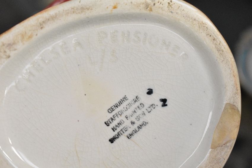 A quantity of 20th-century Royal Doulton pottery character jugs, to include two large exmaples of the 'The Falconer' and 'D' Artagnan'; and four small examples of the 'Beefeater', 'Rip Van Winkle', 'Henry VIII' and 'Long John Silver'; sold with a large Staffordshire Chelsea Pensioner Toby Jug, featuring thee distinctive scarlet uniform and black hat, all marked to base, (8 pieces), condition is consistent with age and use, no visible chips or cracks.