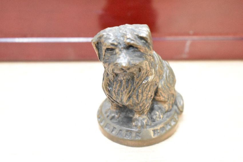 A 19th/20th-century curiosity cabinet-style hinged lid box, featuring a selection of sundry 'curios', to include a small brass oval-formed box; a small turned bone needle sheath; a small hand sculpted clay mask; a cylindrical brass needle case; a Scottish Greyfriars Bobby figurine and more, (1 box, 10 items), condition is consistent with age and use, visible surface wear to the corner of the box, surface scratches and visible wear to items.