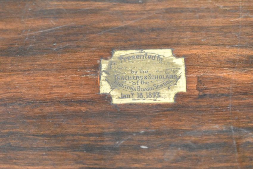 Three 19th-century wooden boxes, comprising two writing desks and a sewing box, each featuring brass or metal detailing and commemorative plaques to the tops of the lids, (3), condition is consistent with age and use throughout. The largest writing slope has broken hinges, with the lid no longer attached to the base; the internal writing slope is also broken, and the inner compartments are damaged. The sewing box has severely damaged internal fabric with missing compartments. The smaller writing desk has sustained extensive damage both internally and externally. All items are sold as seen.
