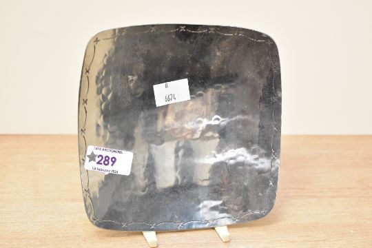 A 20th Century Borrowdale Staybrite stainless steel dish having hand beaten decoration to rim, raised on three cylindrical feet, measures 13cm x 13cm.