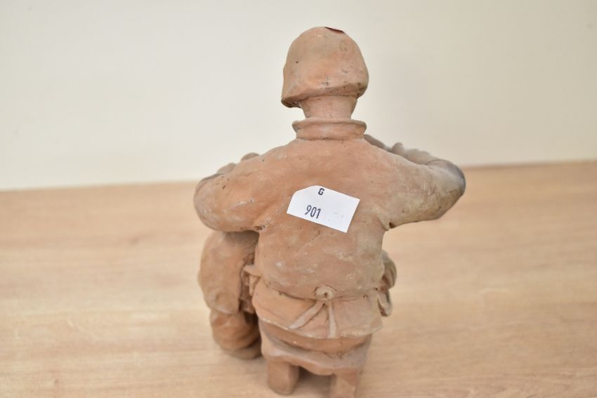 A 20th-century Chinese hand formed terracotta sculpture depicting a mother and child dressed in traditional attire, the figures appear united through the physical continuity of the terracotta,whilst the mother appears to take care of the child, unmarked, 20cm, condition is consistent with age and use.