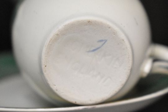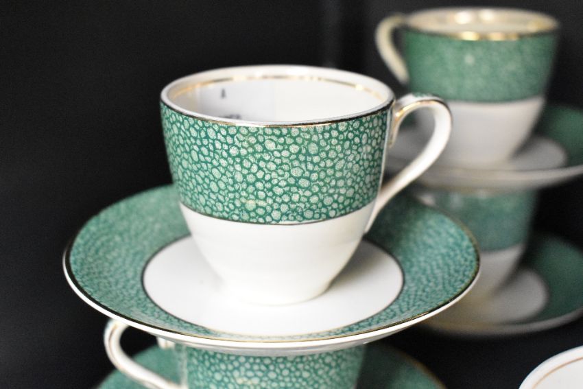 A 20th-century J&G Meakin pottery 'Florida Sol' tea set, featuring rich green speckled decoration and gilded detailing, to include cups, saucers, teapot, milk jug and sugar bowl, all marked to base, (13 pieces), condition is consistent with age and use.