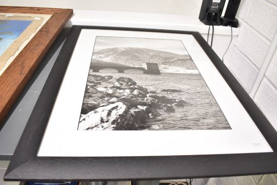 Artist Unknown monochromatic photographic print of a reservoir tower, within card mount and moulded black frame, under glass 30.5cm x 44.5cm & 50.5cm x 65.5cm overall. Sold along with an acrylic Egyptian scene, artist unknown in moulded wooden frame, 41cm x 62cm & 57.5cm x 79cm overall and an After Gill Evans (British Contemporary) limited edition lithograph 'Black Labrador'.