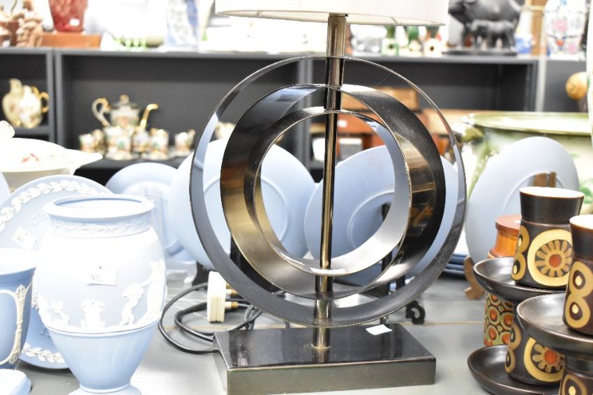 A contemporary British Home Stores metal table lamp, of abstract form, having a grey satin-style shade, 58cm, condition is consistent with age and use.