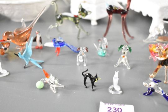 A quantity of mid to late 20th-century Murano-style art glass animal figurines, to include a colourful doe; green cat; pink bird; red and pink fish and more; sold with a small clear mouse with a small penny inside, (approximately 27), condition is consistent with age and use, one bird is missing half of a foot so does not stand, with a couple of tiny chips across some of the others.