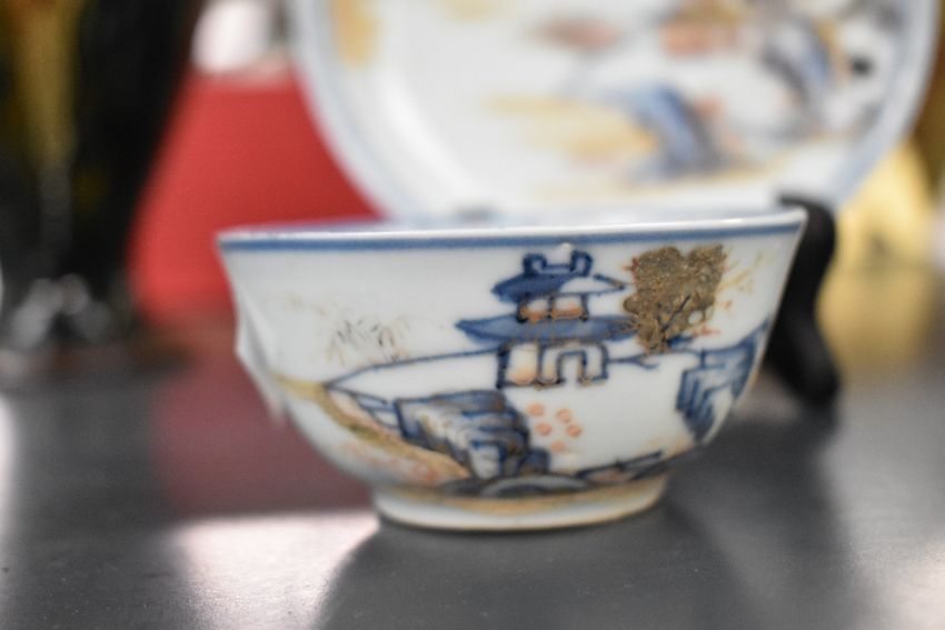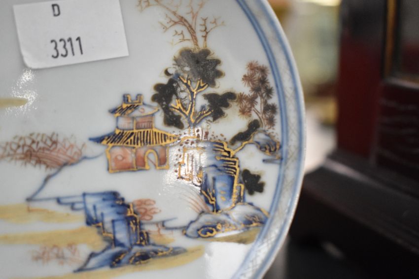 Two pieces of 18th-century Chinese Nanking Cargo porcelain, featuring delicate hand painted garden landscapes, with gilded detailing, Christies Auction sticker to base 'Lot 5194', (2), condition is consistent with age and use, very very small chips to rim of both, visible sand/surface residue to both pieces, most visible to base rim and sides of bowl.