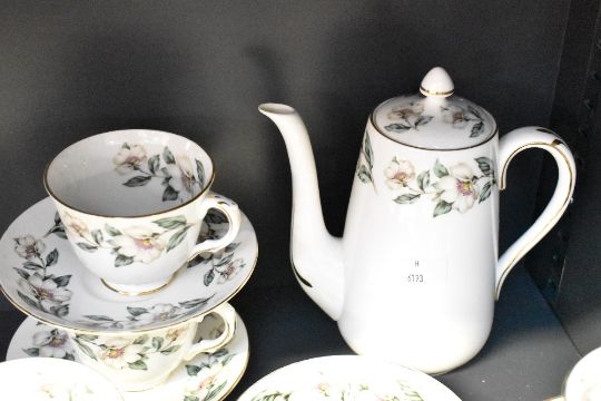 A 20th-century Crown Staffordshire fine bone china 'Christmas Rose' part tea set, featuring delicate white and pink dog roses with green leaf decoration and gilded rim detailing, to include cups, saucers, teapot and small side plates, all marked to base, (approximately 25 pieces), condition is consistent with age and use, some small chips to rim of a teacup visible, slight ware to areas of gilding.