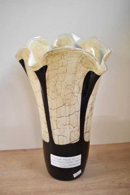 A large mid to late 20th-century Polish hand-blown art glass handkerchief vase, thought to be by Jozefina Krosno, featuring a delicately ruffled top edge with a crackled, marble-like pattern of beige and brown body decoration, unmarked, 40.5cm tall at highest point, condition is consistent with age and use, no visible cracks or chips.