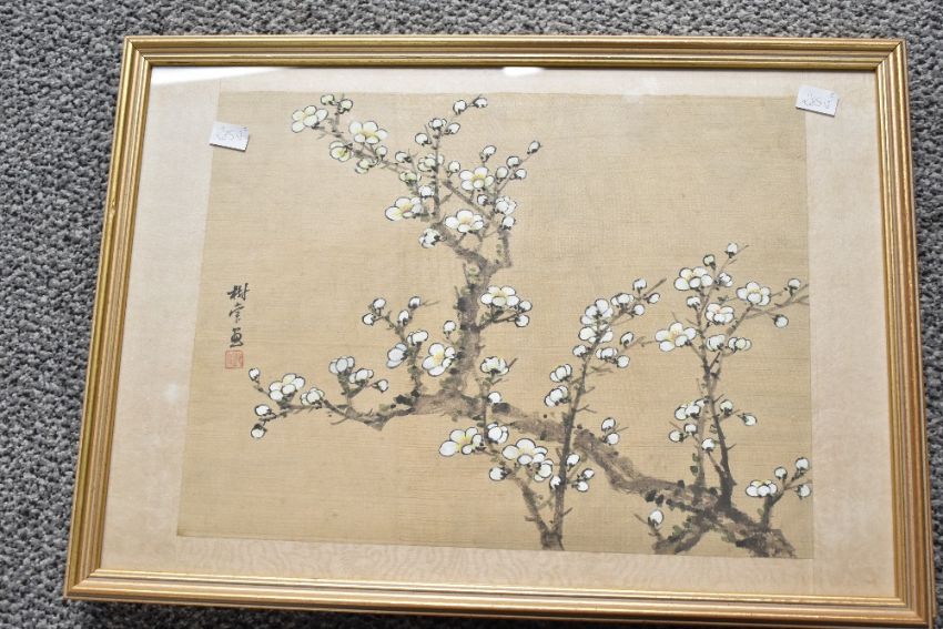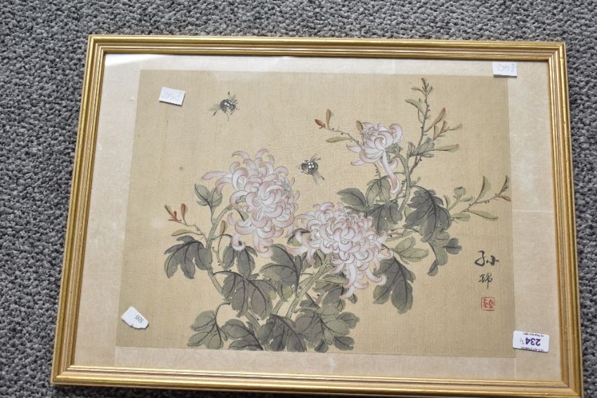 A pair of 20th-century Chinese silk paintings, the first depicting chrysanthemums and bees and the second a branch with blossom, signed with red seals to lower right and left, within moulded gilt frames, under glass 40cm x 29cm and 53cm x 38cm overall.