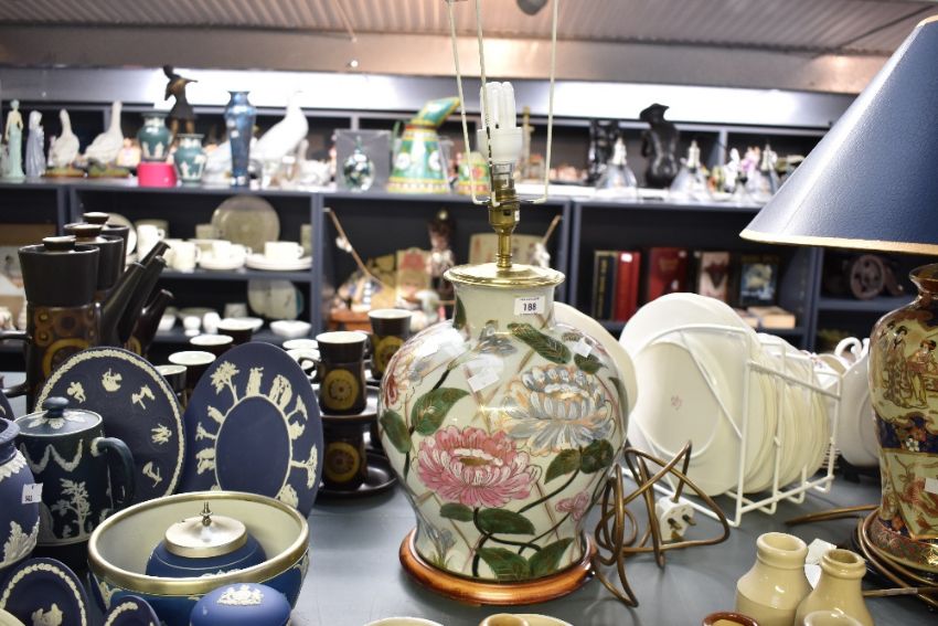 A late 20th-century floral ceramic lamp base, of baluster form, featuring a hand-painted peony-style flowers with gilded detailing, having been mounted upon a circular wooden base, unmarked, 33cm lamp base but from base to brass lamp holder fitting is 62cm, condition is consistent with age and use, sold as seen.