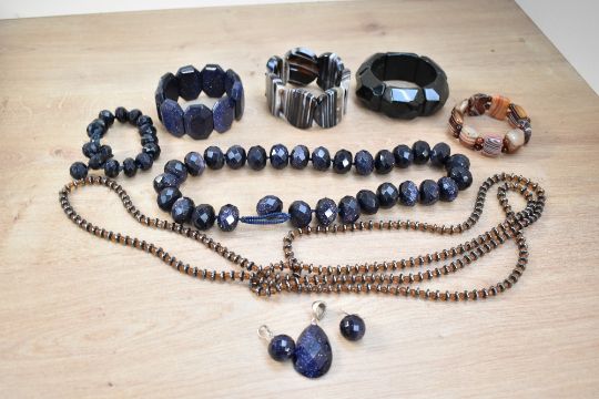 A stackers jewellery tray containing a small selection of modern costume jewellery including blue sandstone beads, pendant, stretch bracelet, chorded bracelet and earrings, two polished stone stretch bracelets, a green sandstone style stretch bracelet and a hematite and bead necklace, (5 bracelets, 2 necklaces, 1 pendant and 1 pair of earrings)