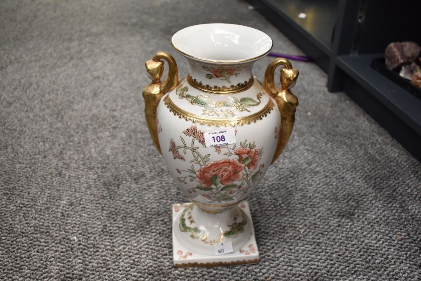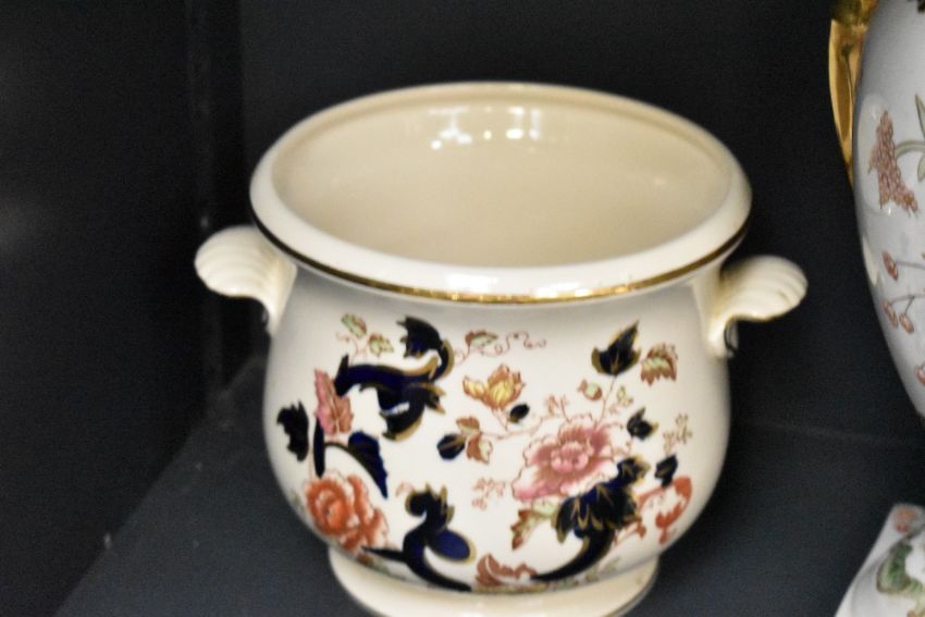 Four 19th to early 20th-century decorative vases, to include a matching Masons Ironstone 'Mandalay' vase and small jardinière, having floral and foliate decoration with gilded detailing; a thought to be Chinese porcelain vase of baluster form, having large floral decoration and gilded female-formed twin handles; and a tall crystal cut vase having a hallmarked Silver rim, through to be marked London, 1925, all pieces marked to base or rim, (4), condition is consistent with age and use.