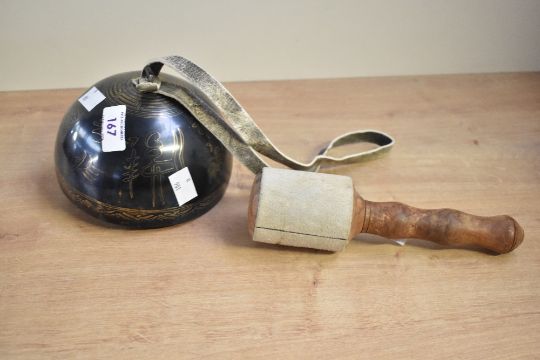 A late 20th-century Chinese handmade brass Yunnan Tea Horse bell, featuring traditional caravan bell decoration, a long leather-like handle and an animal bone clapper; sold with a turned wood and soft leather beater, unmarked, (2), condition is consistent with age and use.