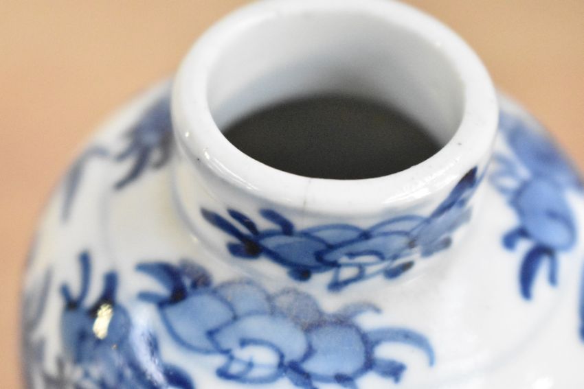 A Chinese blue and white porcelain prunus vase, presumed Kangxi period, of ovoid form with short neck, finely painted with blossoms, foliate tendrils and two birds in flight against a white ground, reign mark to base, 14cm, good condition commensurate with age, small crack to rim.