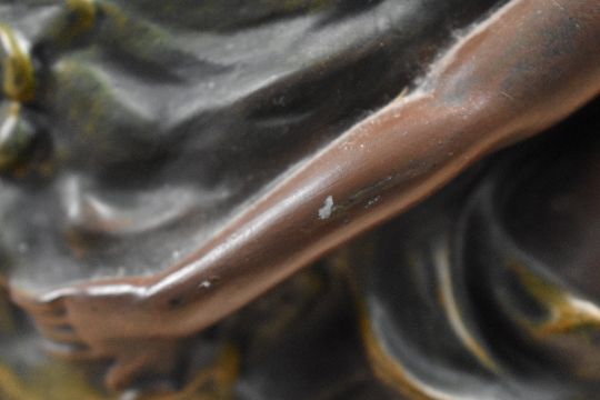 A large late 20th-century cast resin Art Nouveau-style vase, having three semi-nude female figures and floral detailing around the top of the vase, tapering into a scrolled base, unmarked, 33cm in height, condition is consistent with age and use, a couple of chips to resin to some areas of female figures and some surface wear to rest of the vase too.
