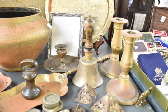 A large quantity of 20th-century decorative metalware, to include a selection of brass postal weights; two miniature camels; two Middle Eastern-style plates having scriptural and foliate motif decoration; two white metal Art Nouveau-style chamber sticks with floral decoration; two sets of brass candle sticks; a small crystal cut glass square ink well upon a bronze base and more, most unmarked, (approximately 30 pieces), condition is consistent with age and use, some natural metal wear is visible.