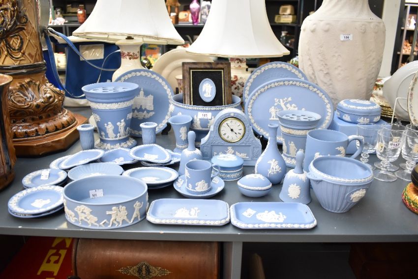 A large quantity of 20th-century Wedgwood Jasperware in blue, to include a selection of decorative plates; a pair of candle sticks; small bud vases; small jewellery and trinket boxes and trays; vases with removable flower frog inserts; a small mantle clock and more, most if not all marked to base, (approximately 37 pieces), condition is consistent with age and use.
