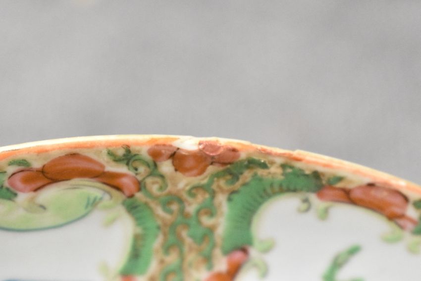 Two thought to be 19th-century Chinese porcelain Famille Rose medallion plates, featuring hand painted figural court scenes and floral decoration with gilded detailing, unmarked, 24.5cm diameter, condition is consistent with age and use, with some areas of surface wear.