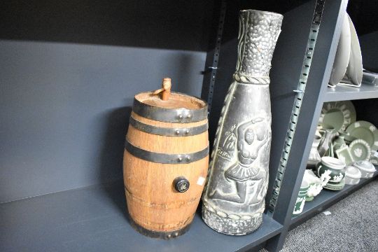 Two 20th-century sundry homewares, including a large Art Pottery lampfoot depicting a male and female form in traditional dress surrounded by leaves and repetitive foliate motifs, and a small wooden barrel with a spigot, (2), light surface wear consistent with age and use.