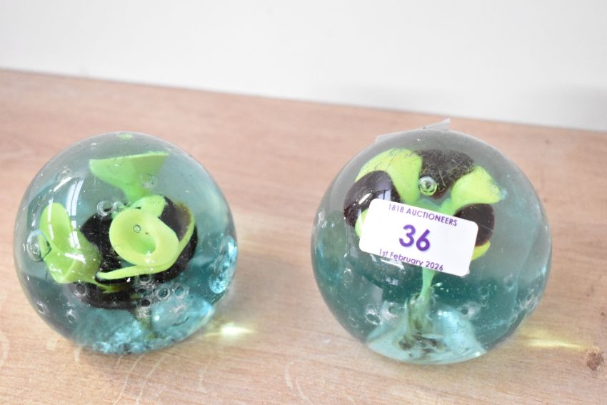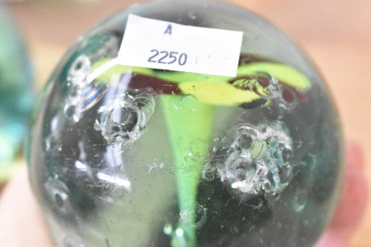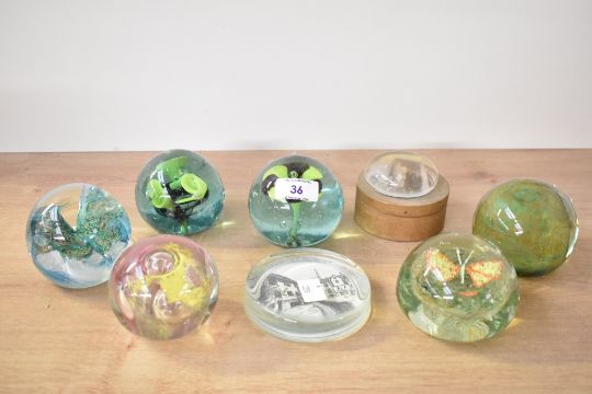 A quantity of 20th-century studio art glass paperweights, to include a Wedgewood example featuring controlled bubbles in pink and yellow, a butterfly example, a planet-like example and more; sold with two commemorative paperweights of London Crystal Palace and City of Norwich, some marked but not all, pontil marks to base of many, (8), condition is consistent with age and use, some are chipped due to previous damage.
