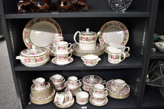 A large quantity of 20th-century Royal Worcester fine bone china 'Royal Garden' part tea and dinner service, featuring a delicate pink and white rose decoration with gilded detailing, to include cups, saucers, teapot, dinner plates, a serving platter, two tureens, gravy boat and more, all marked to base, (approximately 68 pieces), condition is consistent with age and use, light surface wear to some of gilded but no visible chips or cracks.