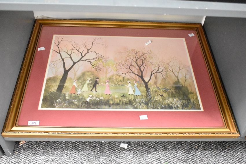 After Helen Bradey (British 1900 - 1979) 'All On An April Evening' a depiction of group picking flowers in a meadow, printed signature to lower right, within pink card mount and moulded gilt frame, under glass 57cm x 39cm & 76.5cm x 60cm overall.