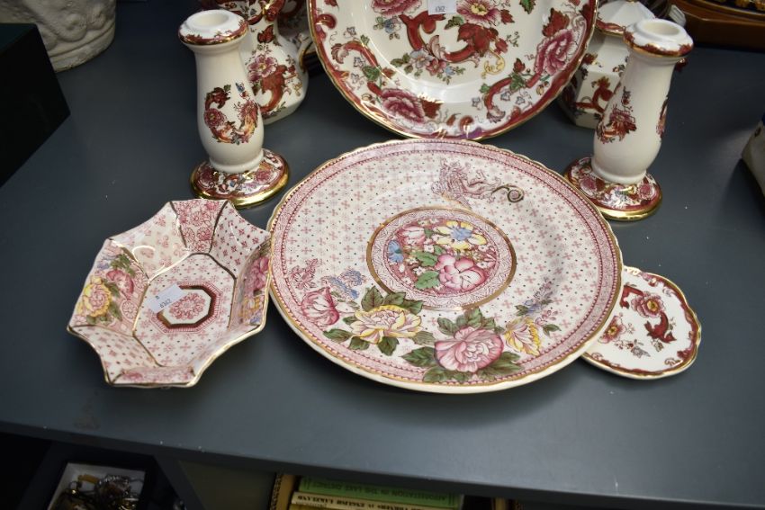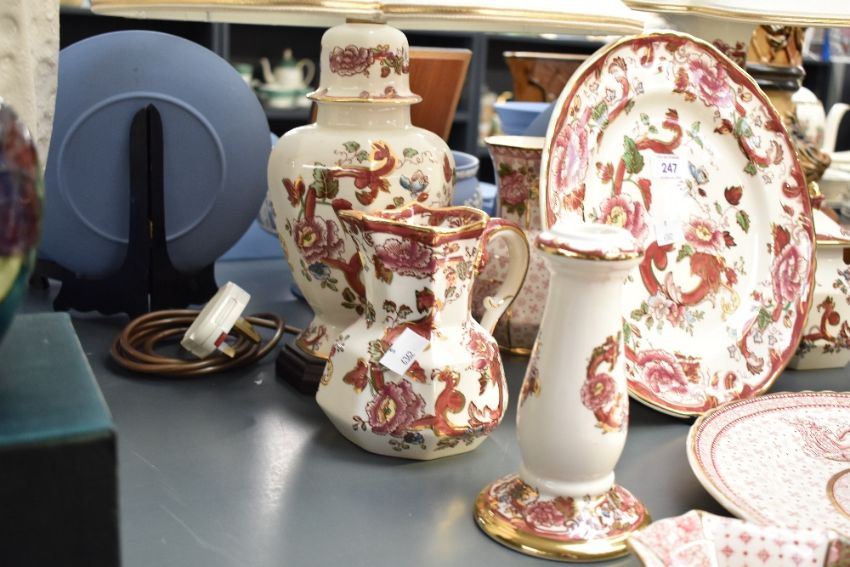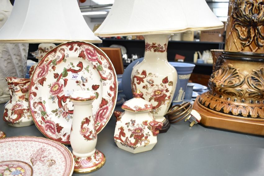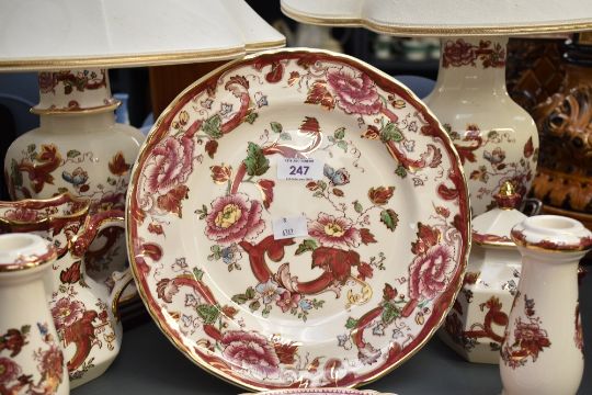 A selection of 20th-century Masons ironstone 'Red Mandalay' and 'Empress' ware, to include a pair of table lamps; large dinner plates; two candlesticks and more, all marked to base, (10 pieces), condition is consistent with age and use, no visible cracks or chipping.