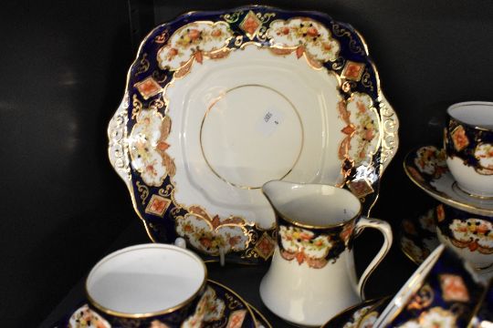 A 20th century Royal Albert Crown China 'Heirloom' tea set, featuring an Imari-style design with a cobalt blue and white ground, decorated with deep orange and gilded floral detailing; comprising small plates, cups and saucers, jug and sugar bowl, all marked to base, (23 pieces), good used condition.