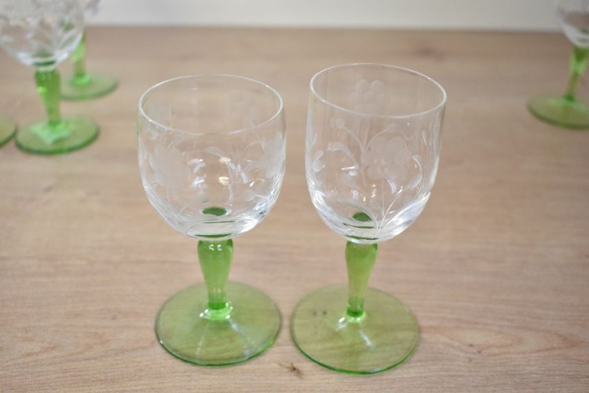 A quantity of seven mid 20th-century green stem sherry glasses, featuring etched floral decoration the the bell, unmarked, (7), condition is consistent with age and use.