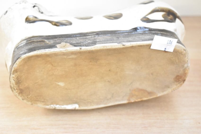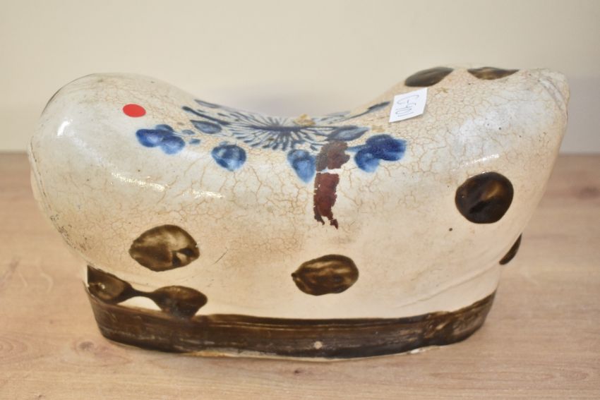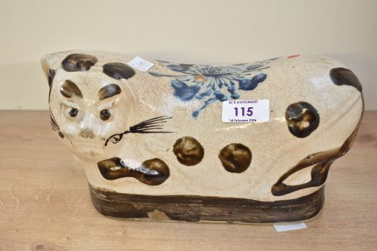 A 19th/20th-century Chinese Qing Dynasty-style Cizhou stoneware headrest, of cat-form having a spotty body and a large blue floral decoration to the centre of its back, unmarked, 23cm, condition is consistent with age and use, some areas of surface wear, a small area of residue upon the back and visible areas of chips.