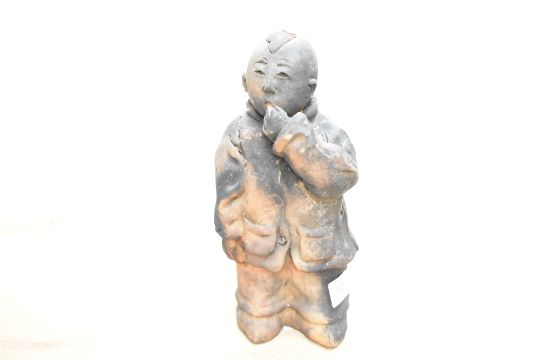 A 20th-century Chinese hand formed terracotta sculpture depicting a stylised young boy in traditional attire, unmarked, 22cm, condition is consistent with age and use with some visible surface scratching.