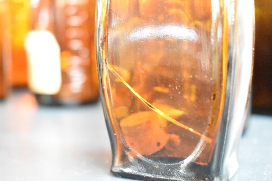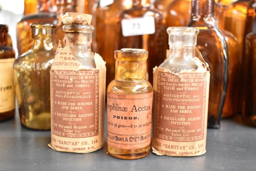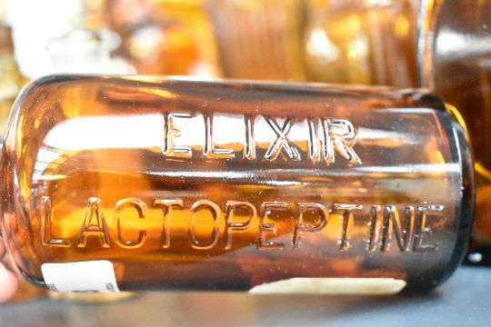 A selection of Victorian apothecary amber-coloured glass bottles, including poison, elixir and medicinal bottles, of varying shapes and embossed detailing, with five retaining their original glass stoppers and five with original paper outer labels present, (20), condition consistent with age and use.