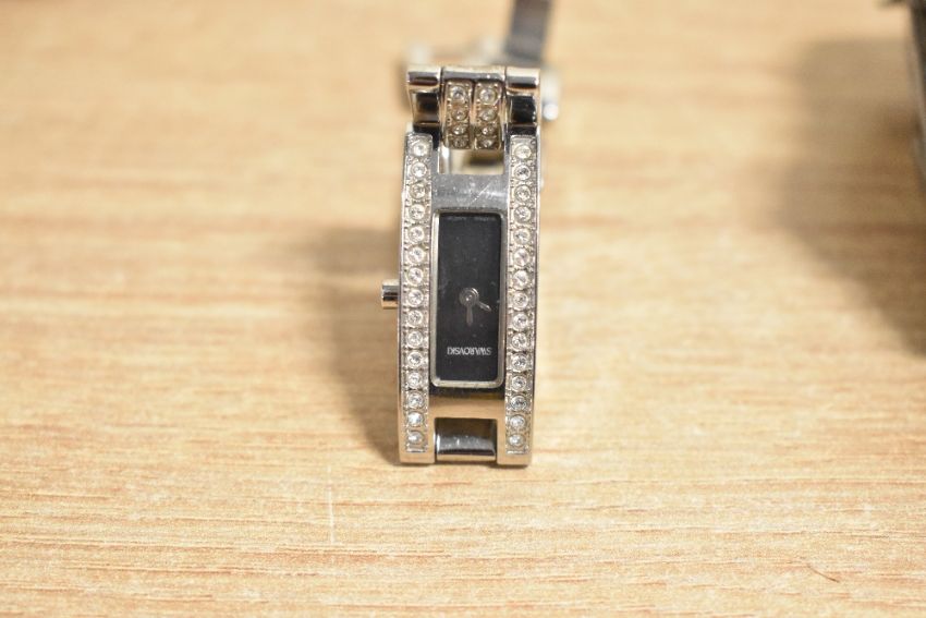 Four ladies fashion quartz wrist watches including Skagen, Fossil, Swarovski and Guess, non presently working