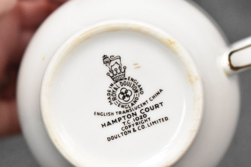 A selection of 20th-century Royal Doulton English translucent china 'Hampton Court' dinner and tea service, featuring a delicate powder blue floral motif with gilded details, to include cups, saucers, plates, sugar bowl, milk jug, large plates, and more, all marked to base (approximately 65 pieces), condition consistent with age and use.