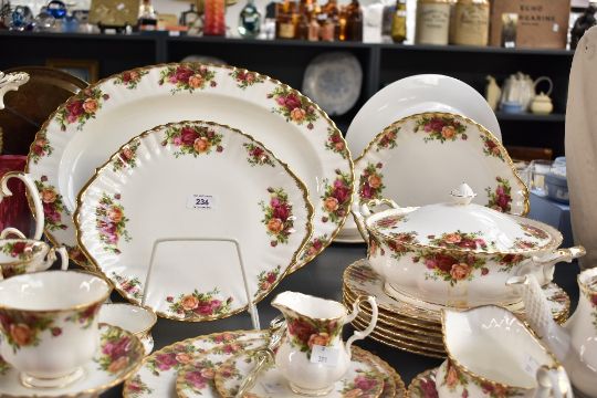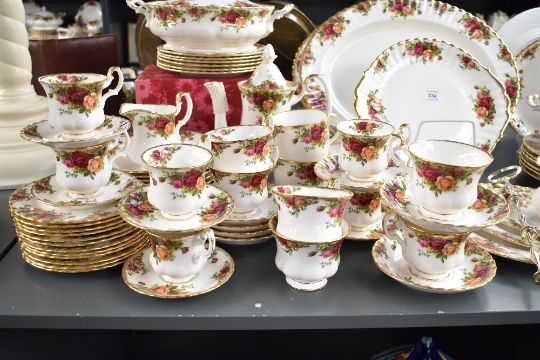 A large quantity of 20th-century Royal Albert 'Old Country Rose' bone china tea and dinner service, featuring a delicate rose pattern with gilded detailing, to include cups; saucers; a three-tier cake stand; tureens; teapot; coffee pot; plates; gravy boats; milk jug; sugar bowls and more, all marked to base, (approximately 71 pieces), condition is consistent with age and use, no visible chips or cracks, some areas of glue residue from stikcers to surface of tureens.