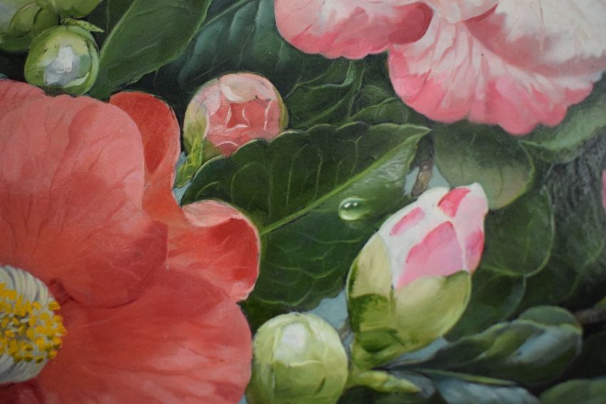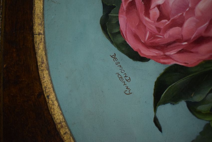 Desmond Kenny (Irish b.1956) Oval oil on board, a floral still life study of peonies and camellia japonica in shades of pink and white on a light blue background ,signed lower right, within wooden slip and moulded wooden frame, 48cm x 57cm & 65.5cm x 75.5cm overall.