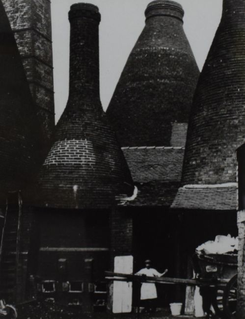 A monochromatic print of a 19th/Early 20th Century photograph, depicting a worker outside of bottle kilns which were mostly associated with the pottery industry of Stoke-on-Trent, against white card backboard and within moulded wooden frame, 22cm x 29cm & 42cm x 53cm overall. Sold alongside a second print of a young boy in an alley behind terraced houses framed as the first.