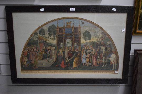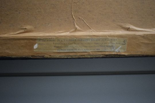 19th Century Arundel Society Chromolithograph 'St. Catherine of Alexandria Pleading Before her Judges', copied by Herr Kaiser and chromolithograph by Fritz Frick, Berlin, entitled and attributed with printing details verso, within card mount and flat wooden frame, under glass 78cm x 45cm & 95cm x 62cm overall.