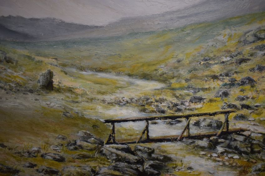 *Local Interest* John Schofield (British 20th Century) Oil on board 'Scafell Pike and Lingmell from Sty Head' England's tallest mountain as seen from the pass associated with the 'Corridor Route' ascent, signed lower left, attributed and entitled verso, within moulded canvas lined frame, 60cm x 44.5cm & 67cm x 51cm overall.